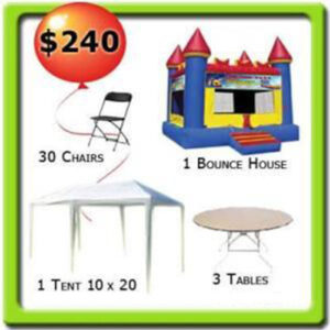1 Combo Bounce House - 1 Tent 10x20 - 3 Tables - 30 Chairs